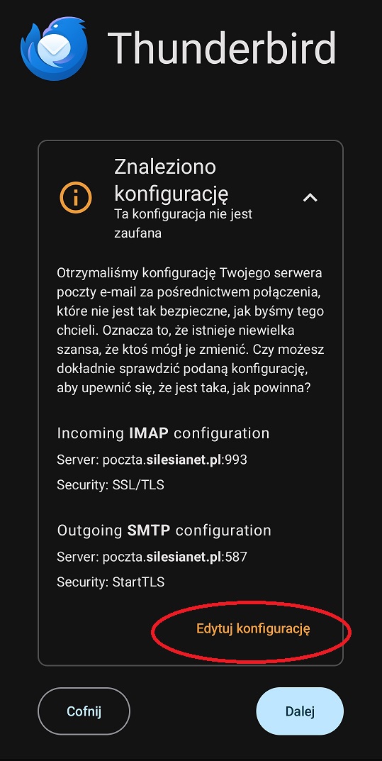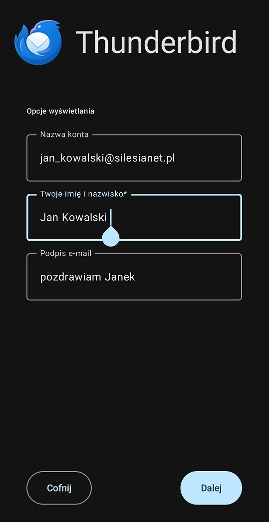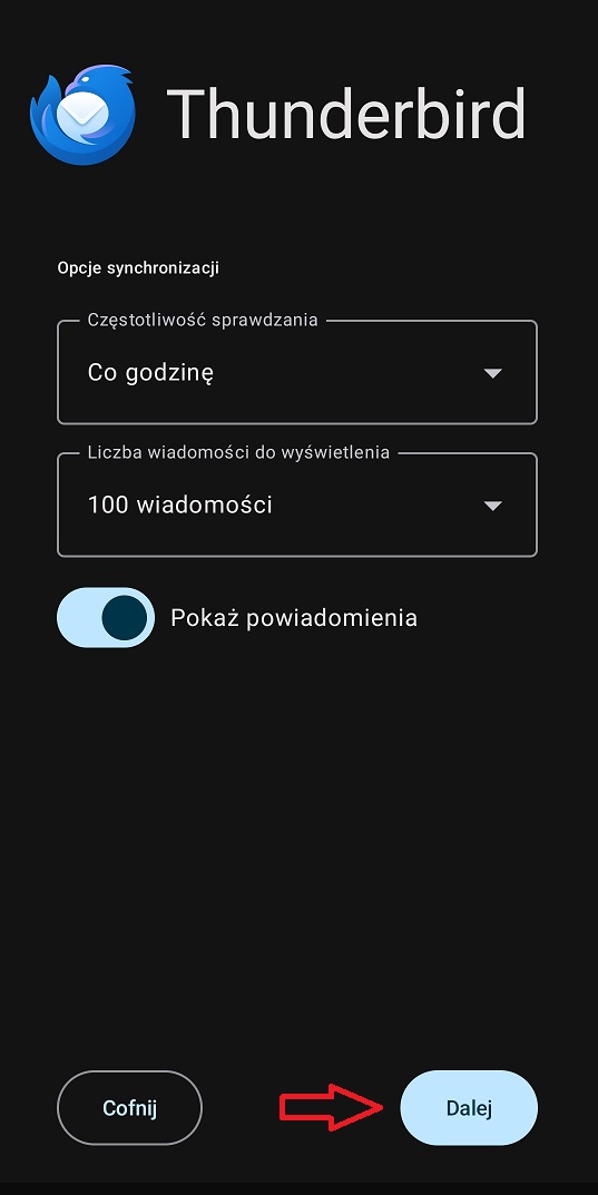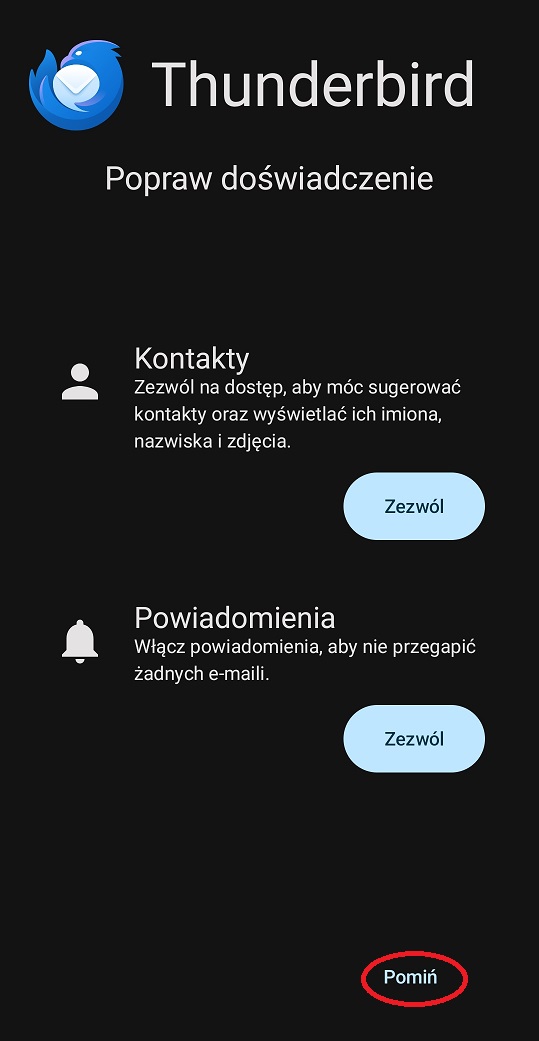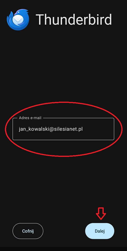 Aby skonfigurować klienta poczty Thunderbird na telefonie z systemem Android: