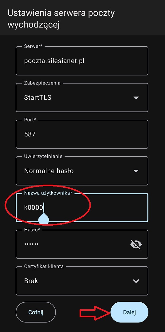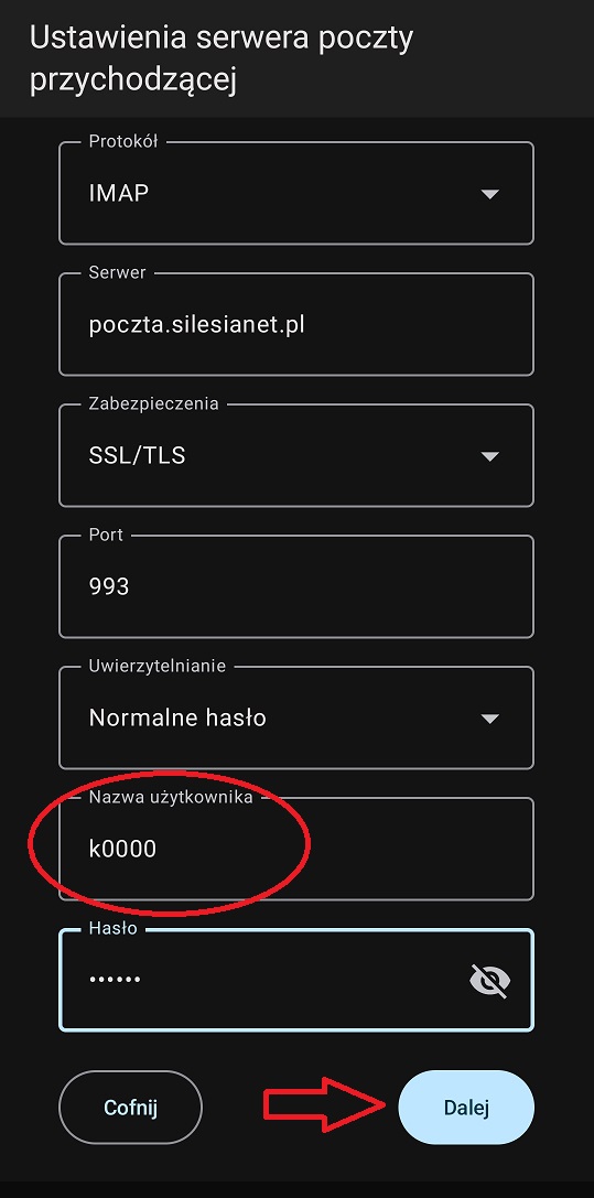 - Nazwa użytkownika: k0xxx format jak we wcześniejszym przekładzie