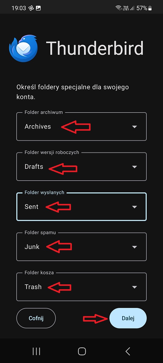 - Teraz należy określić foldery specjalne jak na poniższym przykładzie